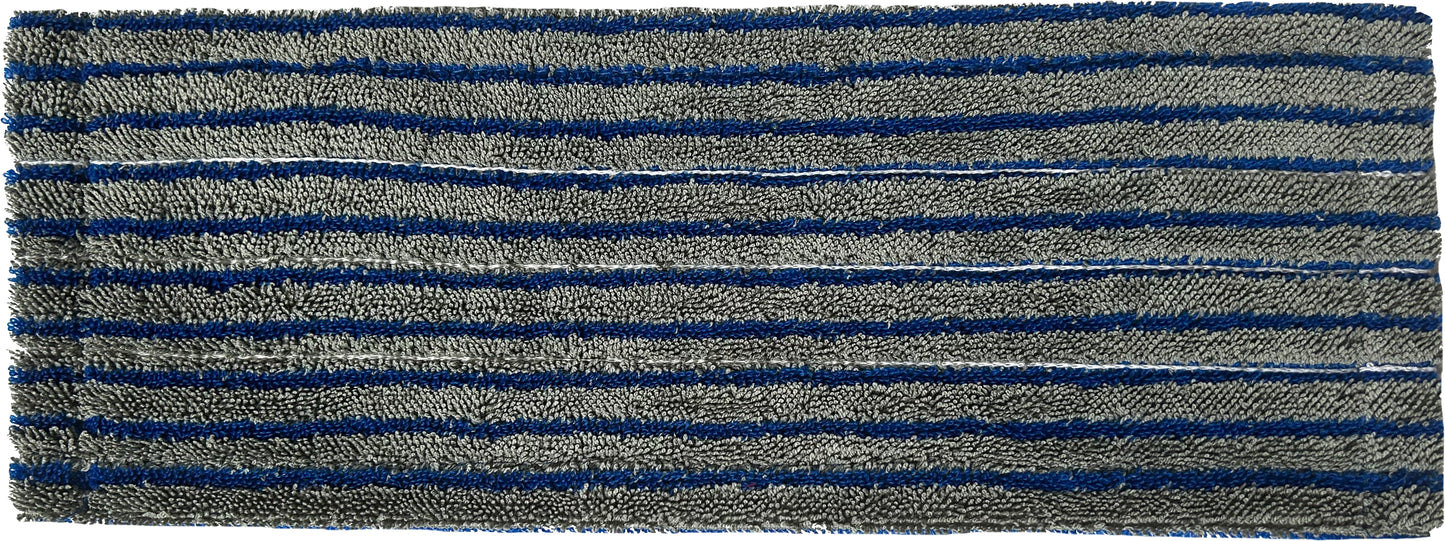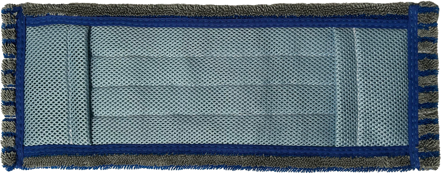The product includes a microfiber perforated mesh backing on the bottom and the pockets, which will allow for easy saturation of the entire mop while allowing the mop to breathe and reduce post-use bacteria growth potentials within the mop. The backing is produced with elasticity properties to ensure a snug and proper fit on the pocket mop frame at all times. Combining these two features produces a higher-performing and more durable product that will also be more energy efficient in processing.